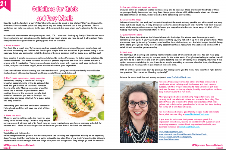 Well, I couldn’t go back and say, “Just kidding!” HaHaHa So, I pulled a blog and a contributing article together! The idea that I submitted was “Guidelines for Quick and Easy Meals.” Here’s the link for the MOMpreneur Success magazine (my article is on page 21).