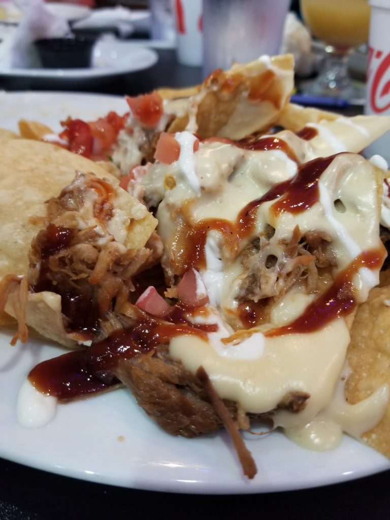 A variety of interesting food ended on our table, and it was all very good. Bacon wrapped scallops, Shrimp & grits, fish and kid sliders to name a few. However, nachos is one of our favorites, gluten-free or not! So, when we saw Pulled Pork Nachos on the menu, two plates of it ended up on our table. Smokey, crunchy, spicy, sweet, creamy… Let’s just say that the ones that didn’t order nachos for dinner may have regretted it. So, so good!!!