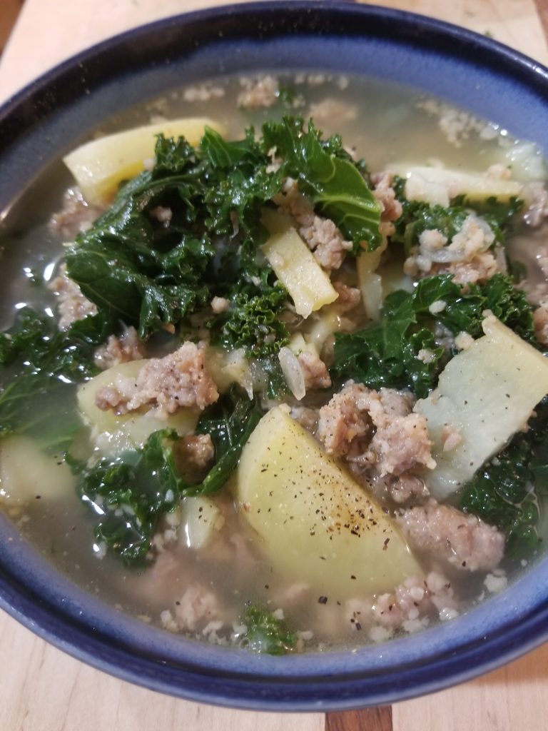 My husband and I actually like a lighter, heartier version of Zuppa Toscana soup. Those words don’t normally go together, but I leave out the cream, giving you have a lighter broth. Then, I add more tender, chewy kale without adding more broth. To me, the addition already makes it a heartier soup, but it also changes the ratio of ingredients to broth.