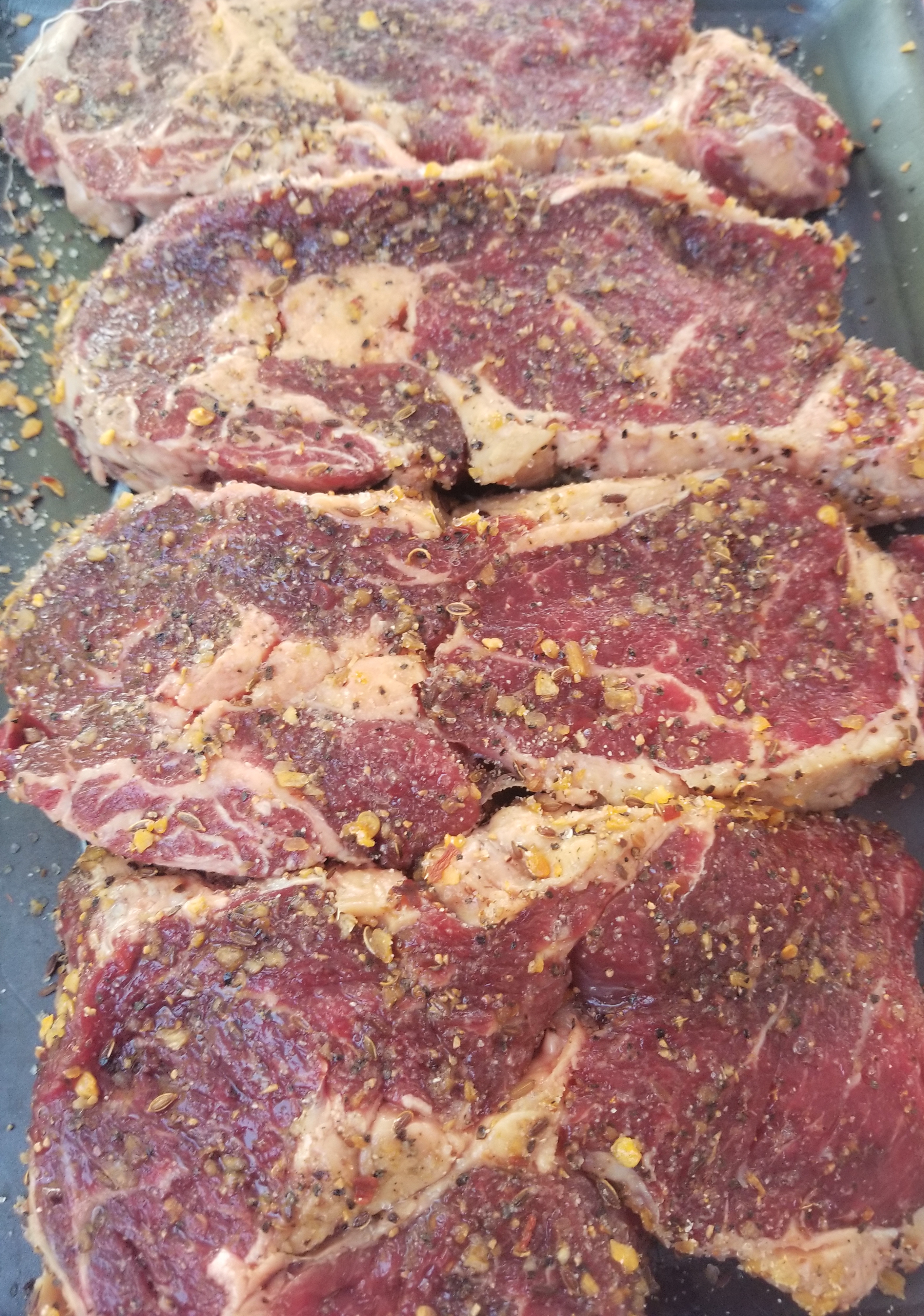 - Seasoned or marinated steak, chicken, pork or shrimp directly on the grill or skewered into kabobs.